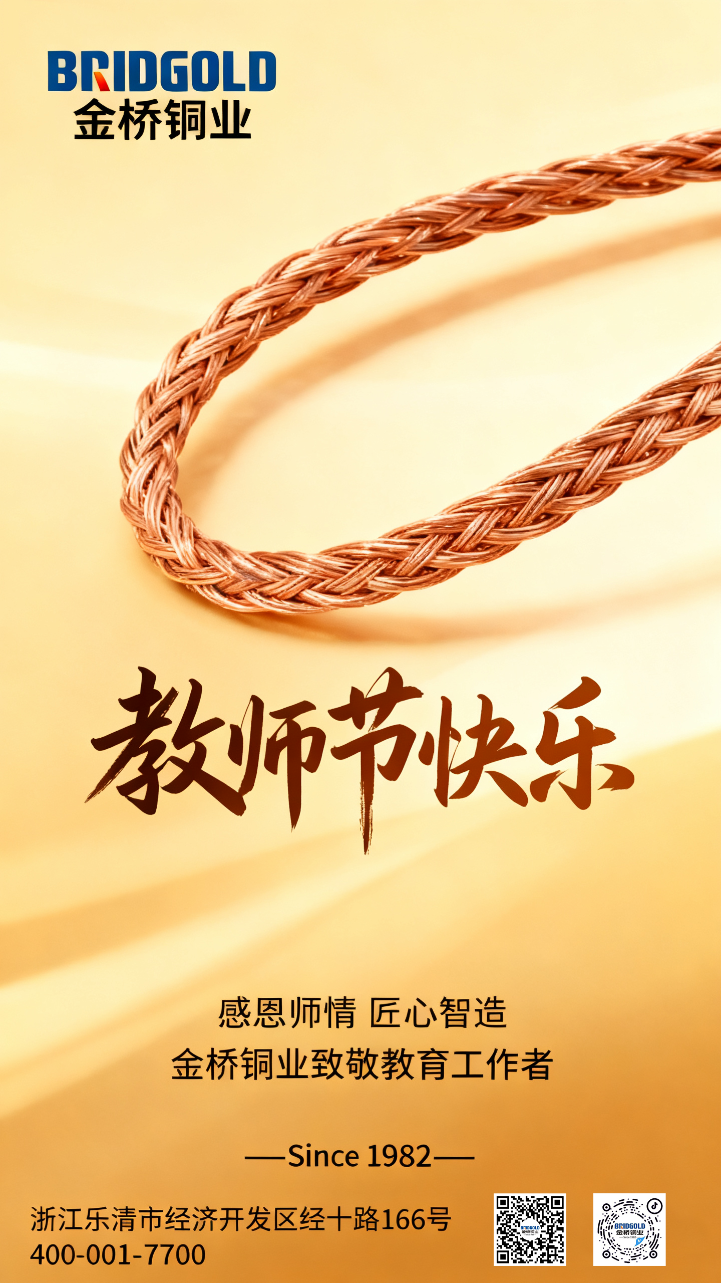 三尺講臺(tái)育桃李,一寸丹心照九州。在第40個(gè)教師節(jié)來(lái)臨之際,金橋銅業(yè)懷著滿心敬意,向每一位點(diǎn)亮學(xué)子未來(lái)的教育工作者致敬。老師們用數(shù)十年如一日的堅(jiān)守,在黑板與課本間搭建起知識(shí)的橋梁,這份執(zhí)著與專注,恰似金橋銅業(yè)對(duì)銅編織線產(chǎn)品的匠心打磨。?